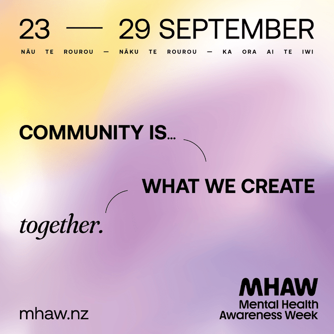 This is the theme for MHAW 2024. The Mental Health Foundation says, "Community looks different for everyone — that's the beauty of it. It’s about connecting with others to create something together. This MHAW, we’re encouraging the people of Aotearoa to define, build, and celebrate their communities. Nāu te rourou, nāku te rourou, ka ora ai te iwi. With your food basket and mine, the people will flourish."