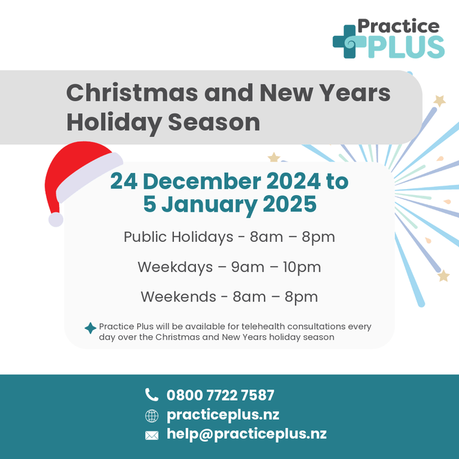 You can access same-day virtual care with Practice Plus throughout the Kirihimete and New Year period